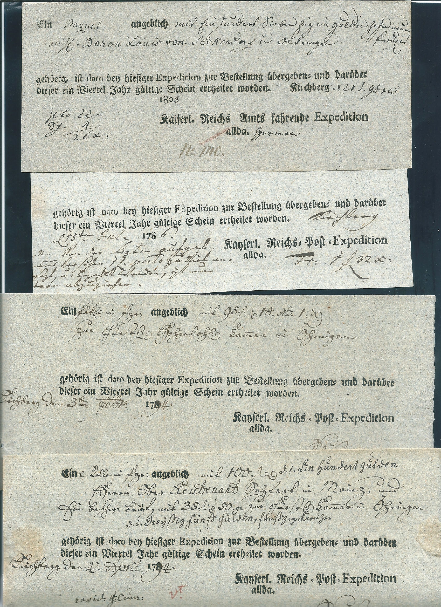 "Kirchberg", 1784-1803, vier Ortsdruck-Postscheine der Reichspost