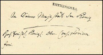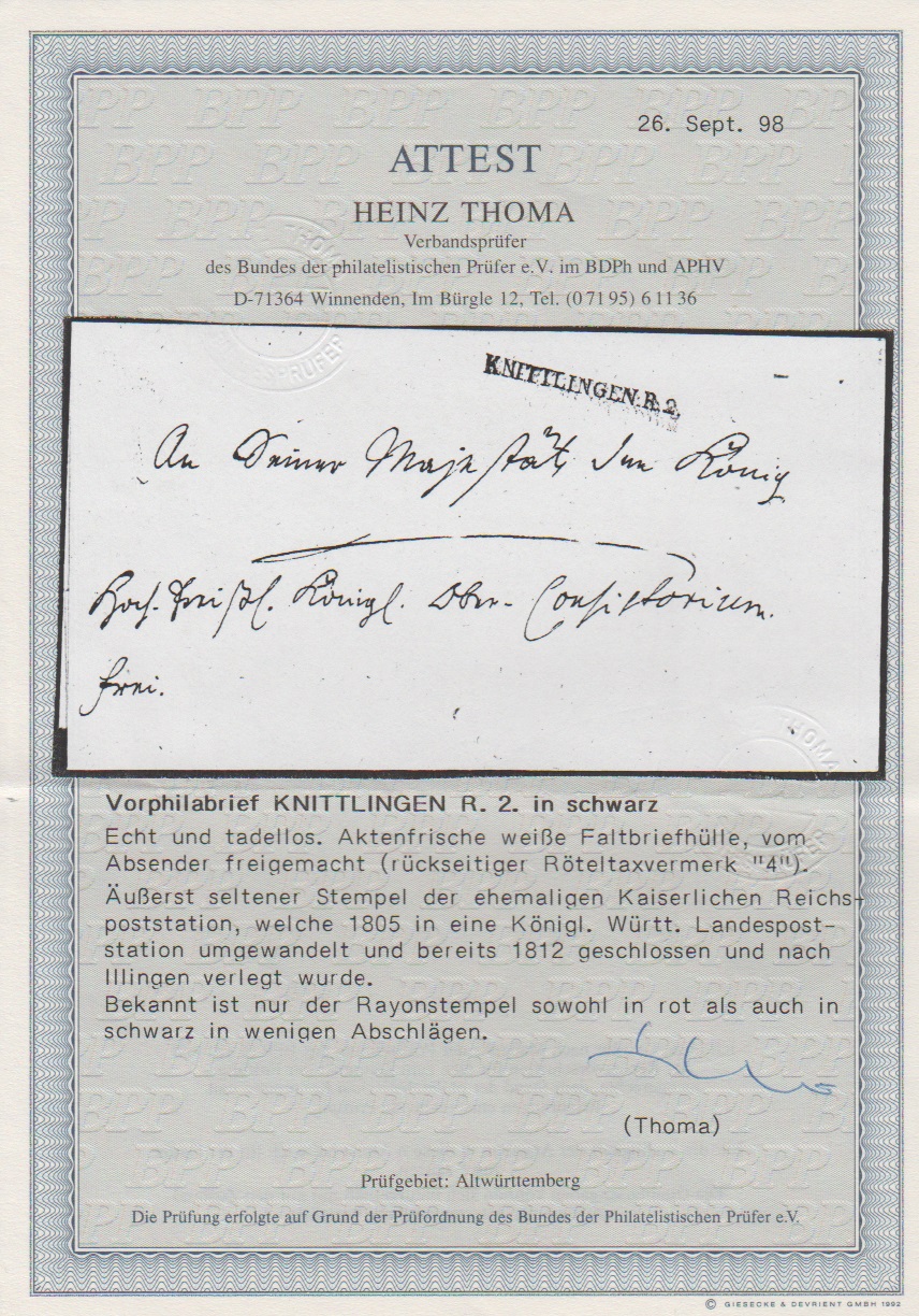 "Knittlingen R.2", (1810), klarer schwarzer L1 auf Brief "An Seine Majestät den König", nur wenige Briefe bekannt, Postanstalt 1805 eröffnet, 1812 wieder geschlossen, Feuser 1000,-, Attest Thoma, ex Bloch