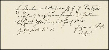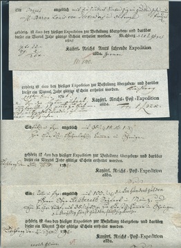 "Heilbronn", 1754-1761, "Postwagen-Expedition zur Rosen", "Fahrender Post dahier", acht hs. Post-Einlieferungsscheine