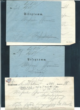 "Hohebach", 1897, zwei kpl. Telegramme (blaue Couverts mit zugehörigem Inhalt), je in den eigenen Landbezirk nach Stachenhausen, wofür "Botenlohn 80 Pfg." für die Bestellung durch Expreßboten vom Empfänger erhoben wurde