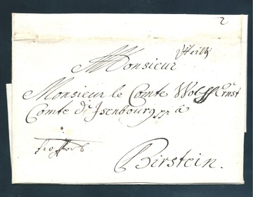 "Heilbronn", 1723, sehr früher postalischer Vermerk "V. Heilbr. fr." auf Brief "fro. Ffort" nach Birstein, Inhalt aus Langenburg/Hohenlohe