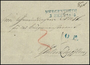 "Mergentheim", blauer L2 nebst blauem L1 "O.P." (= Ostpreußen) auf Brief 1845 nach Unterschefflenz, interessanter Stempelirrtum