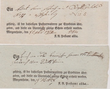 "Mergentheim", 1804/8, zwei versch. Ortsdruck-Postscheine der Reichspost, sowie seltener Hochformat-Zeitungsschein 1805 "K.R. Postamt"