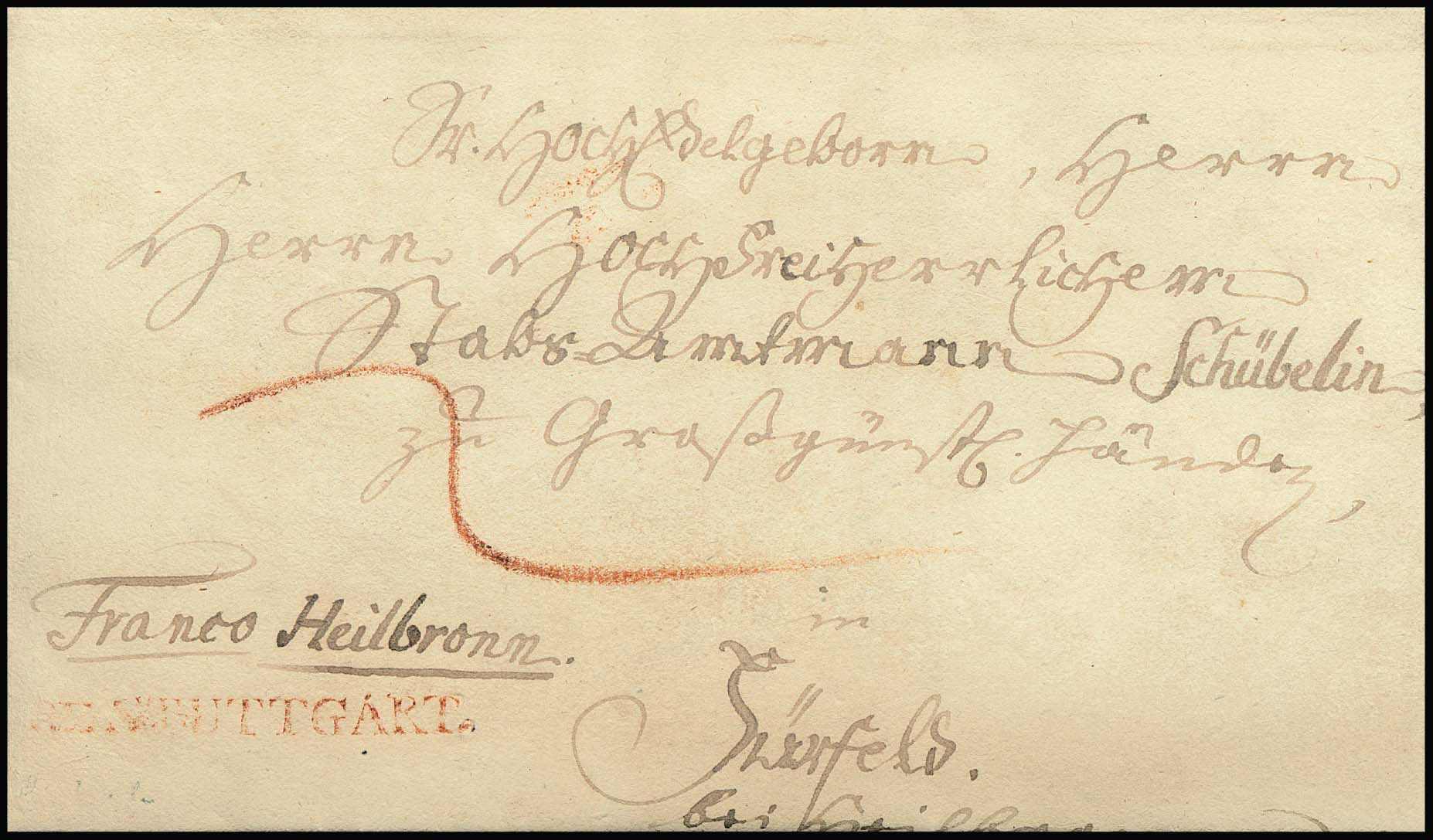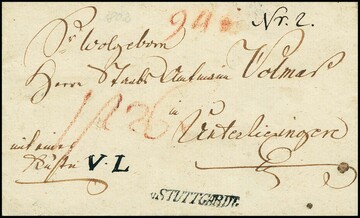"Stuttgart", 1784, klarer erster L1 "DE STUTTGART" in rot mit Inhalt (Feuser 1200,-), sowie in schwarz auf Briefhülle