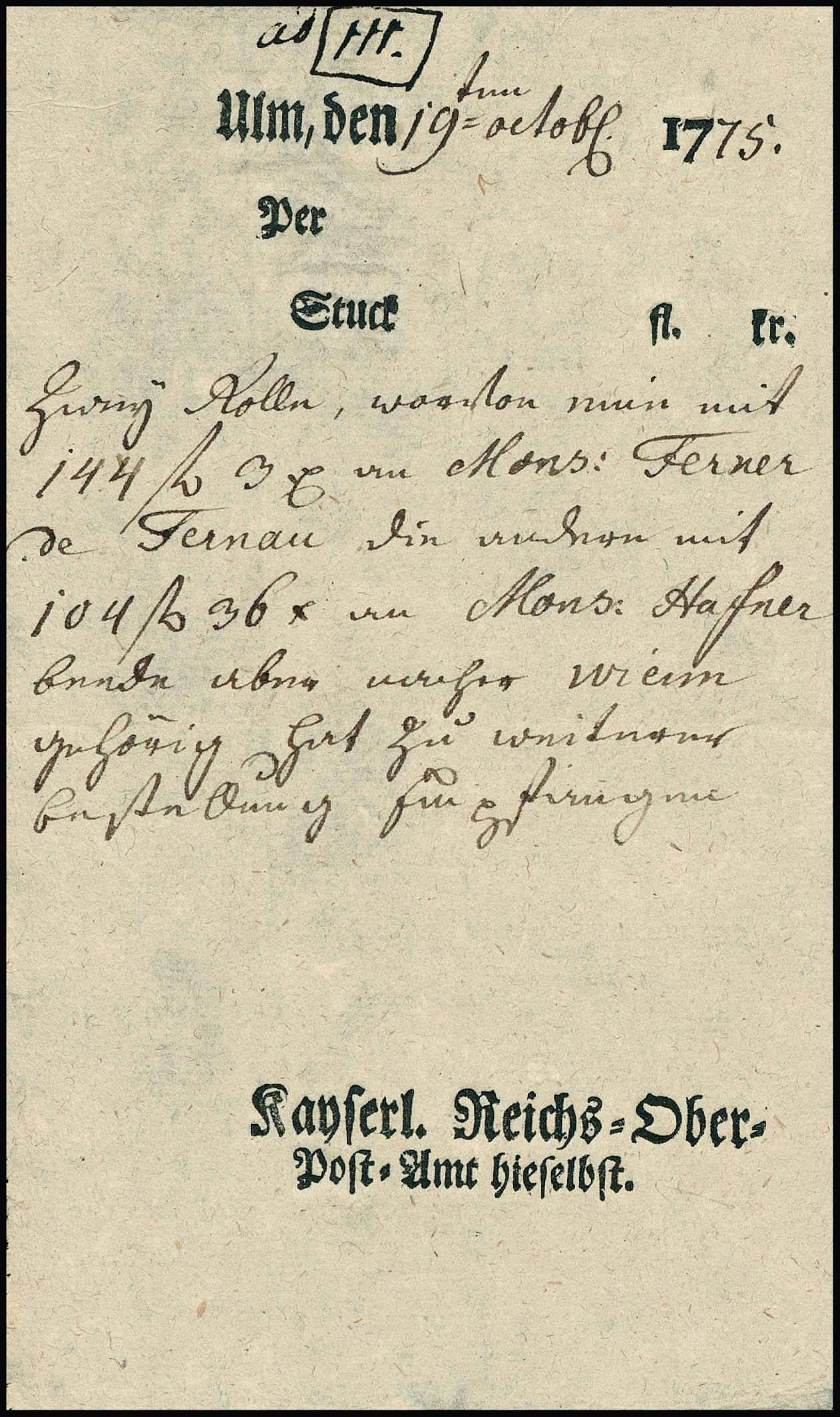 "Ulm", 1780, kleiner Ortsdruck-Einlieferungsschein für ein Wertpaket, "kayserl. Reichs-Ober-Post-Amt hieselbst"