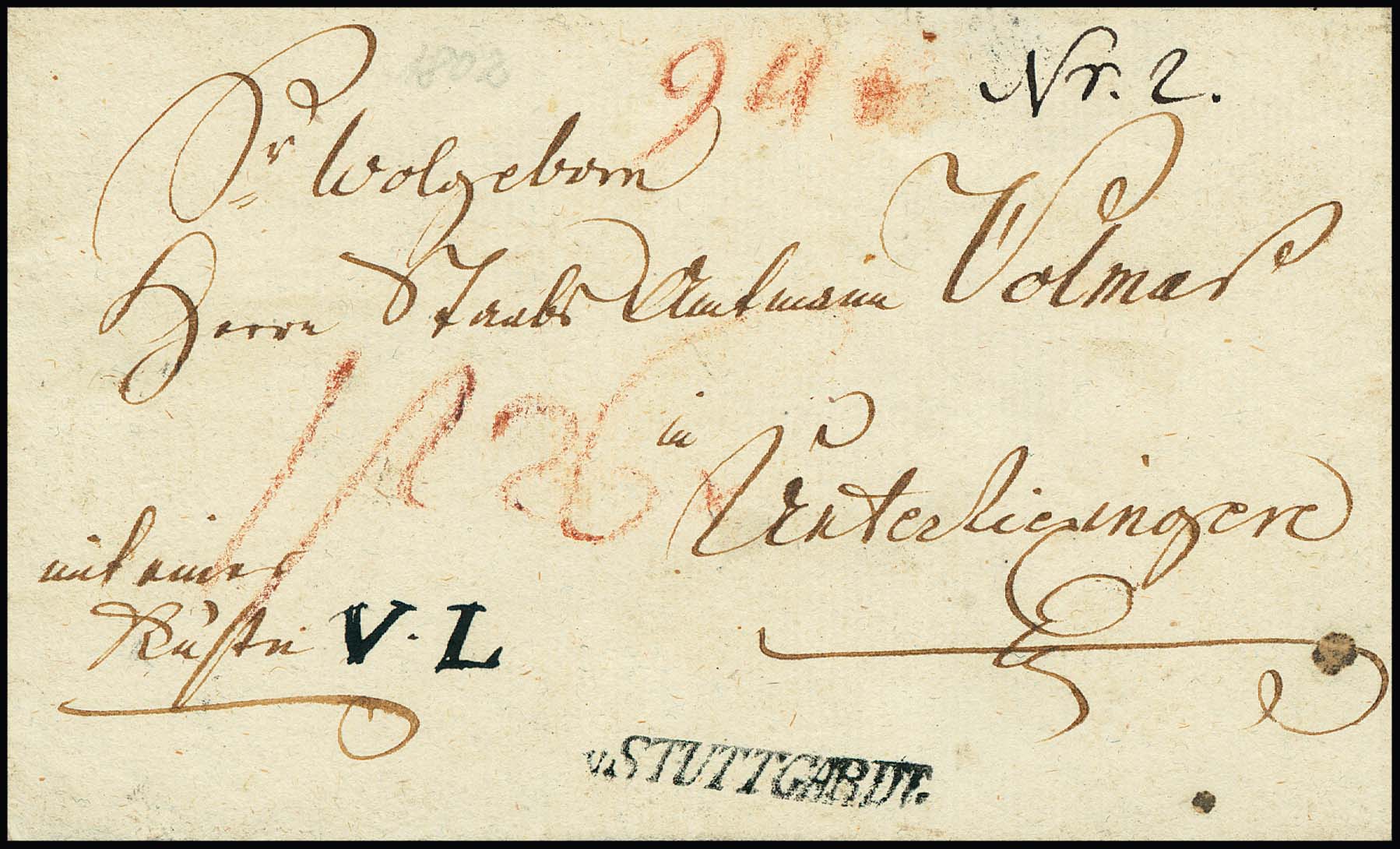 "Stuttgart", (1802), seltener kursiver Fahrpost-L1 "V. STUTTGARDT" auf Paketbegleitbrief (Hülle) nach Unterriexingen