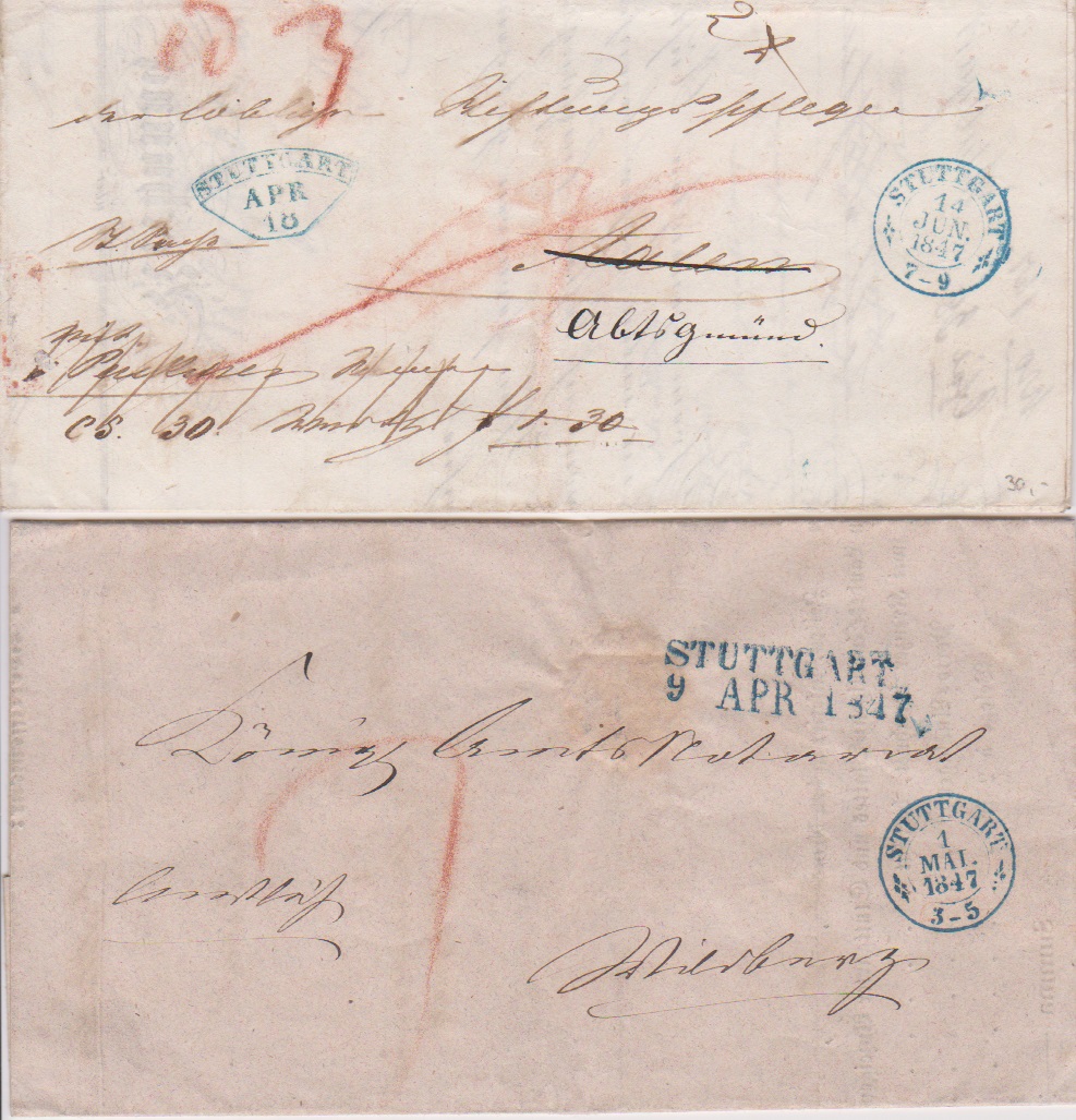 "Stuttgart", 1847, blauer K2 und L2, bzw. K2 nebst Fächerstempel, auf zwei Prachtbriefen