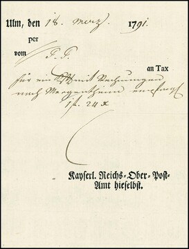 "Ulm", 1791, "Kayserl. Reichs-Ober-Post-Amt hieselbst", seltenes "Postcharten"-Formular als Gebührenquittung für eine Kiste