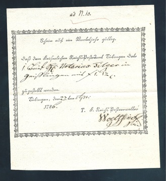 "Tübingen", 1786, Ortsdruck-Postschein der Reichspost, "T.K. Reichs Postverwalter" mit Zierrahmen