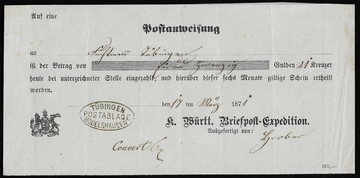 "Tübingen-Bodelshausen", 1871, Postablagestempel auf zwei Postanweisungs-Aufgabescheinen