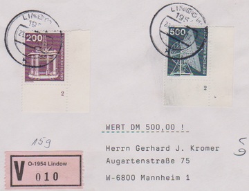 200 u. 500 Pfg. Industrie u. Technik, je rechte untere Bogenecken mit Formnummern "2" auf Wertbrief aus Lindow 1992