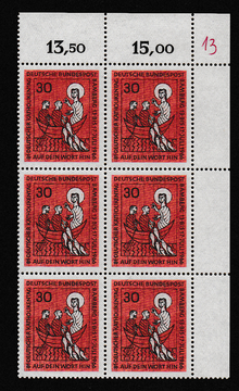 30 Pfg. Katholikentag, postfrischer Sechserblock aus der rechten oberen Bogenecke, auf Feld 20 Plattenfehler "retouchierte Ecke". Mi. 300,-