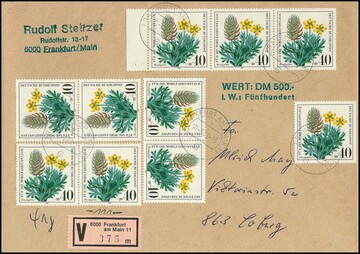 Jahrgänge 1977 bis 1980, elf portogerechte Belege mit ungewöhnlichen bzw. hohen Mehrfach-Frankaturen seltener Wertstufen: Nr. 925 per fünf, 973(5), 979(5), 1032(5), 1039(6), 1047 (per fünf auf Expreßkarte), 1048 (per fünf und per sechs), 1053(4), 1057(6) und 1059 per zehn (!)