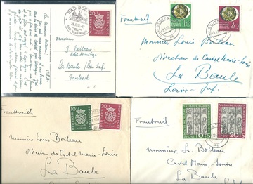 Bach, Marienkirche und Wuppertal je als portoger. 30-Pfg.-Frankatur auf drei Briefen (Nr. 141 min. getönt), sowie 20 Pfg. Bach einzeln auf Auslandskarte, alle vier aus einer Korrespondenz nach La Baule/Frankreich. Mi. 590,-