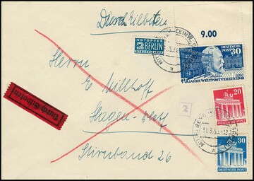30 Pfg. Stephan vom Oberrand, nebst 20 u. 30 Pfg. Bauten, auf Expreßbrief (typische Gebrauchsspuren) von Mittelberg/Kleinwalsertal, 31.3.50, nach Hagen. Sehr seltene Verwendung dieser Sondermarke im österr. Zollanschlußgebiet! Sign. Schlegel