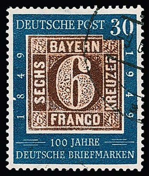 30 Pfg. 100 Jahre Briefmarken, Plattenfehler "Einkerbung am linken Bildrand" gestempelt, Mi. 380,-