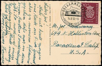 Bach, vier versch. portoger. EF/MeF: 10 Pfg. als EF auf Postkarte und auf Übersee-Drucksache, sowie im Paar als MeF, ferner 20 Pfg. als gute EF auf Übersee-Postkarte