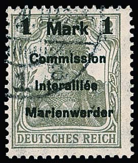1 Mk. a. 2 Pfg. mit zwei Aufdruckfehlern, "Marienwerder links unten abgeschrägt" und "linke 1 mit fehlendem Anstrich", gest. Mi. 350,-
