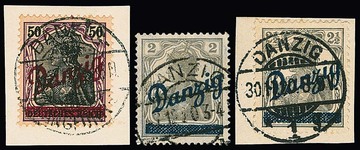5 und 15 Pfg. je mit Aufdruckfehler "Denzig" gestempelt, sign. Gruber bzw. Fotoexp. Tworek. Mi. 400,-