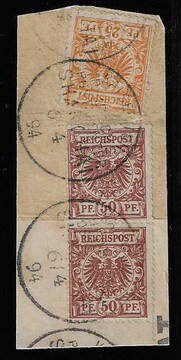 Vorläufer Krone-Adler 25 Pfg. (kl. Eckbug) und Paar 50 Pfg. braunrot auf Briefstück mit Stempel "Shanghai" 1894, sign. Jäschke-L. Mi. 300,-