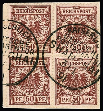 Vorläufer Krone-Adler 50 Pfg. braunrot im Viererblock auf Briefstück mit K1 von Shanghai 1891, sign. Steuer. Mi. lose 680,- +