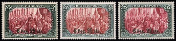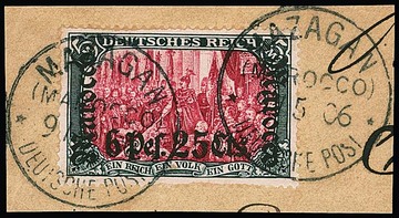 "Fetter Aufdruck", Zusammenstellung inkl. 1 Pes. 25 C. auf 1 Mk. ungebraucht, sowie 5 C. und 2 Pes. 50 C., 3 Pes. 75 C. und 6 Pes. 25 C. je gestempelt, Mi. 1275,-, ex Grobe
