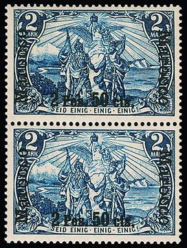2 Pes. 50 C. a. 2 Mk. im senkrechten postfrischen Paar mit beiden Typen I und II zusammenhängend, sign. Steuer. Mi. 780,-