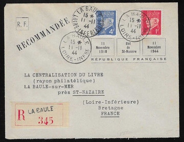 St. Nazaire, 11.11.1944, Frankreich 1 und 4 Fr. Petain, sog. "Gedenkblock", auf Kapitulations-R-Brief aus La Baule, sign. Tust