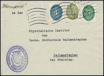 4, 5 und 6 Pfg. Strohhut als seltene Frankatur auf "Warenprobe"-Päckchen-Adresse von der Technischen Hochschule München nach Weihenstephan. Typische Gebrauchsspuren wie schräge Knitterung, aber für Dienstmarken sehr ungewöhnliche Portostufe