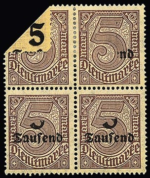 5 T. a. 5 Mk. im Viererblock, unteres Paar postfrisch, oberes ungebraucht, dabei unteres Paar Ziffer 5 fast ganz fehlend, rechte obere Marke nur kleine Aufdruckteile und linke obere Marke Bogenumschlag, siehe Foto