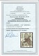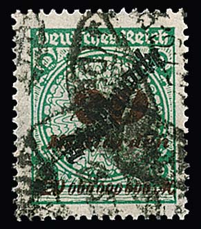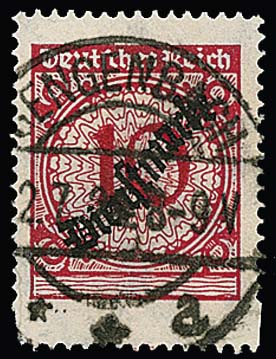 10 Pfg. zentrisch gestempelt, durch versetzten Kammschlag markantes Überformat und dadurch unten seitlich teils ungezähnt, siehe Foto, sign. Peschl