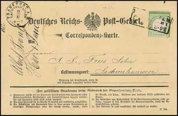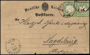 1/2 Gr. ziegelrot einzeln auf Orts-Correspondenzkarte (re. oben Fehlstelle) aus Leipzig, 26.6.72, moderierte Rate (statt normal 1 Gr.) bei Auflieferung von mind. 60 Sendungen, erst ab 1.7. galt das reduzierte Porto, sehr seltene Rate, dazu 1 Kr. grün auf Orts-Correspondenzkarte aus Frankfurt vom 2.6.72