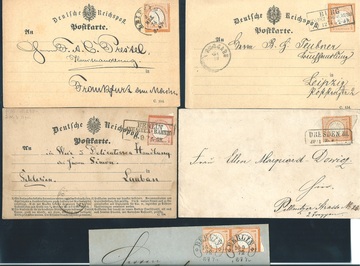 1/2 Gr. rotorange einzeln auf Kabinett-Ortsbrief aus Breslau, ferner per zwei (kl. Zf.) auf Brief, mit Plattenfehler III ("Farbstrich") auf Postkarte (Mi. 160,-), sowie loses Kabinettstück mit blauem Stempel (Fotoexp. Krug)