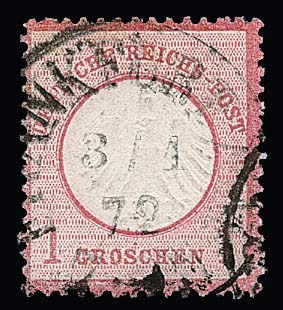1 Gr. rosa mit zentrischem K1 "Frankfurt a.M." vom 3.1.1872. Ungewöhnlich sehr frühe Verwendung einer Groschen-Marke im Kreuzergebiet! Fotoexp. Sommer