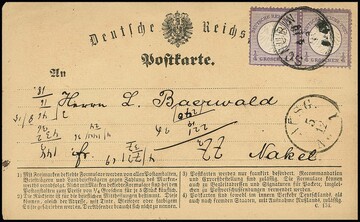 1/4 Gr. violett im Paar (min. "eckrund") auf Postkarte mit K1 "Schubin", Mi. 500,-