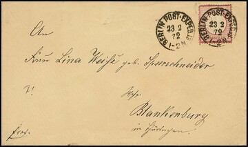 1 Gr. rosa (zwei kurze Zähnchen) mit besserem K1 "Berlin Post-Exped. 13" auf Firmen-Werbecouvert mit rs. Zudruck einer "Rolljalousieen"-Fabrik