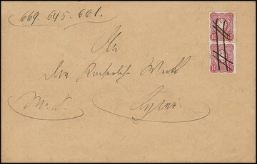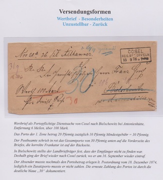 10 u. 20 Pfge. rs. auf Wertbrief von Cosel nach Bielschowitz im Landbezirk von Antonienhütte, dort Empfänger vom Landbriefträger nicht zu ermitteln und retour, wofür der Absender nochmals 30 Pfg. zu bezahlen hatte, übliche Gebrauchserhaltung