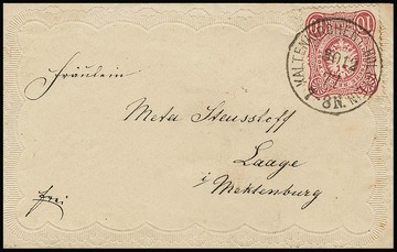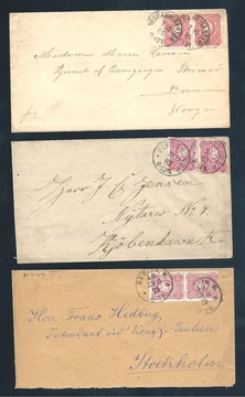 10 Pfge. bzw. zweimal 10 Pfg. je per zwei auf drei Skandinavien-Briefen, 1879 nach Stockholm, 1883 nach Kopenhagen (stärkere Gebrauchsspuren) und 1885 nach Drammen/Norwegen