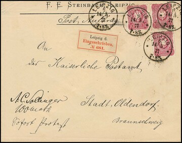 10 Pfge. rosa per drei bzw. 10 u. 20 Pfge., auf zwei eingeschriebenen Postaufträgen, 1877 aus Leipzig und 1879 aus Rostock (hs. "Sofort zu Protest")