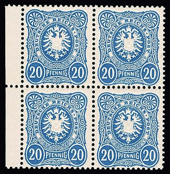 20 Pfg. lebhaftkobalt, tadellos postfrischer Viererblock vom linken Rand, sign. Petry. Mi. 680,- +