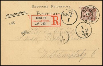 Zwei eingeschriebene Orts-Postkarten aus Berlin, 1883 mit 25 Pfg. braun einzeln, sowie 1899 mit 20 Pfg. auf 5 Pfg.-Karte