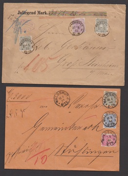 50 Pfg. per zwei nebst 5 Pfg. (aus Magdeburg), sowie einzeln nebst 10 u. 20 Pfg. (min. getönt) aus Landshut (Brief zweiseitig geöffnet), auf zwei Wertbriefen, einmal trotz Vorausfrankatur rs. Bestellgeld erhoben, einmal nur rs. quittiert