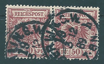 50 Pfg. bräunlichrot, UV "feuerrot", im Paar mit Stempel von Berlin, 3.12.89, sign. Zenker. Mi. 200,-