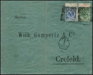20 Pfg. einzeln auf zwei Briefen (einmal kl. Papierfehler), unbeanstandet in Frankreich verwandt mit französ. K2 "Marseille Bourse" 1890 bzw. "Rouen" 1896, je ohne Nachtaxe nach Deutschland