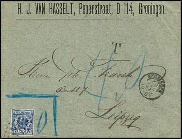 20 Pfg. auf zwei Briefen unzulässig im Ausland verwandt, mit ital. K1 "Giussano" 1899 ohne Nachtaxe nach Berlin (Mgl.), sowie aus dem holländischen Groningen (Marke mit NS) mit Nachtaxe