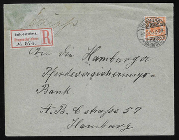 25 Pfg. dunkelorange, Plattenfehler "I von REICHSPOST oben gespalten" einzeln auf Orts-R-Brief (Couvert leichte Gebrauchsspuren) aus Hamburg, ein Zahn, sign. Jäschke-L.