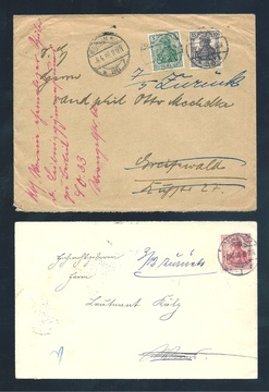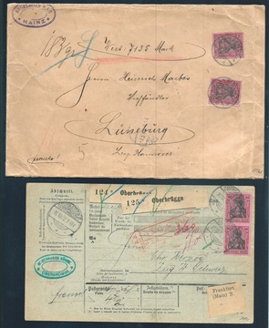 5 Pfg. Kriegsdruck per 40 vs./rs. als seltene hohe MeF auf Brief aus Schönkirchen 1922, gebrauchsbedingte Erhaltung, dazu Wertbrief mit fünfmal 10 Pfg. 1906, sowie Mehrfach-Frankatur 10 Pfg. (Nr. 86I) per acht, ungewöhnliche MeF!