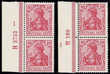 3 Pfg., fünf versch. postfrische HAN-Randstücke: "101", "102", "175", "202", 243" (einmal offensichtlich bessere Farbe, aber kurze Zähne), 5 Pfg. als HAN-Paar ("2054"), ferner 10 Pfg. zwei postfr. HAN-Paare ("189", "3573"), sowie 10 Pfg. einzeln ("2793"). Mi., ohne die bessere Farbe, 1330,- +