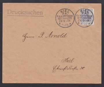 2 Pfg. auf Orts-Druckasache aus Kiel mit seltenem Feldpost-Stempel "Kiel P.A. f.d.K. Britische Geschwader" 1904