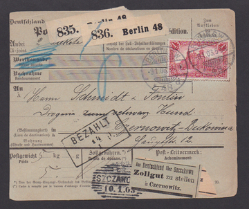 1 Mk. Germania ohne Wz., B-Zähnung, als gute Einzelfrankatur auf Auslands-Paketkarte, kl. Mgl.